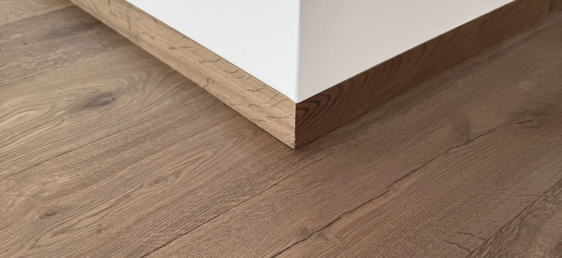 Ukázka moderního řešení lištování podlahy. Podlahová lišta “lícuje” s omítkou, a eliminuje tak prostor pro ulpívání prachu. Výhodou je také možnost situování nábytku těsně ke zdi. Cena je orientační, vždy se musí individuálně nacenit dle složitosti a připravenosti stavby. Zde technické informace a příprava.